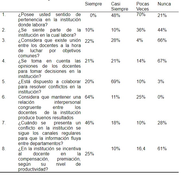En relación con las opiniones de los docentes sobre la cultura organizacional se evidenció en los resultados poco trabajo en equipo, debido a que no se integra a los docentes a la toma de decisiones, así mismo se evidenció que los valores no se refuerzan y el lenguaje no es acorde a una institución educativa, así mismo se constató en algunas ocasiones poca motivación por parte del personal docente. Sin embargo, los encuestados manifestaron necesario asistir a un plan de capacitación para el fortalecimiento de la cultura organizacional, aspecto relevante para la toma de decisiones por parte del personal directivo.
