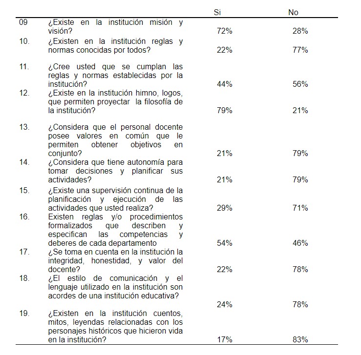En relación a los encuestados afirman que no existe en la institución un lenguaje acorde a una institución educativa con un 24% acorde, un 78% no acorde a una institución educativa, así mismo se refleja en los resultados que no se integra al personal docente a la toma de decisiones institucionales, con un 79% un 21% manifestaron que si se toma en cuenta al personal para la toma de decisiones, así como tampoco se refuerzan los valores de la institución, siendo necesaria desde la visión de León (2017), generar una transposición organizacional con la finalidad de promover una cultura organizacional en favor de promover la eficacia en la institución.