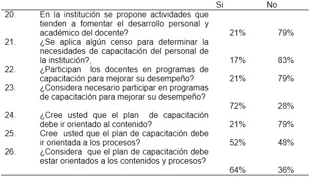 Con relación al plan de capacitación , la mayoría de los encuestados manifestaron que no se fomentan actividades que tiendan a fomentar el desarrollo personal y académico de los docentes con un 79% , mientras el 21 % manifestaron si se proponen actividades para fomentar el desarrollo, de igual manera el 83% manifestaron que los docentes no participan en programas de capacitación, sin embargo el manifestaron estar dispuestos a participar en un programa de participación para mejorar su desempeño, con un 72% afirmaron que participarían, mientras un 28 % afirmaron no participar, en palabras de Silva (2018), se hace conveniente desarrollar una formación integral en los facilitadores con la finalidad de que pueda existir mayor posibilidad a la consecución de una cultura organizacional que promueva la eficiencia institucional.