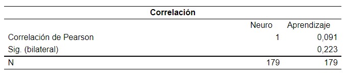 La correlación es de 0,091 catalogándose como una correlación positiva muy débil, así como la significancia bilateral es mayor a 0,05 lo cual indica que se rechaza la hipótesis afirmativa y se acepta la nula, por lo tanto, se sintetiza que la neurodidáctica influye sobre el aprendizaje significativo, sin embargo, debe ser afinada o perfeccionada en su aplicación por parte de los docentes para elevar el valor de correlación y potenciar la probabilidad de que se genere significancia bilateral menor a 0,05