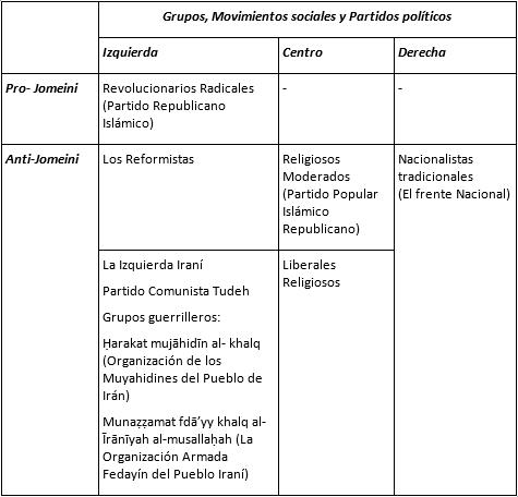 En la siguiente tabla 1 se detalla una clasificación de los grupos y movimientos sociales que operaban en el especio político iraní: