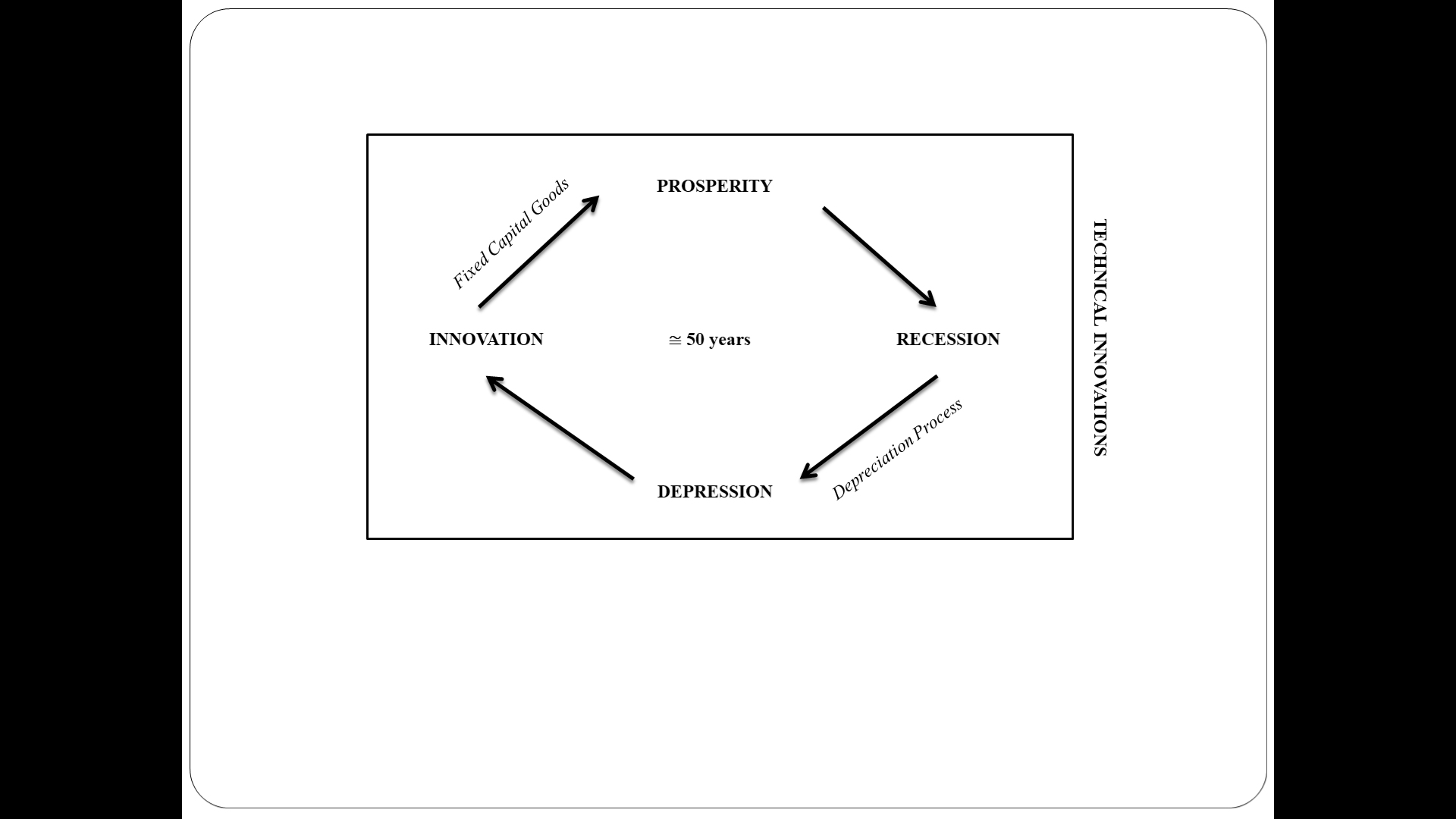 According to Kondratieff's scheme (1935), the capitalist system is flawed due to its cyclical nature, involving four main stages: prosperity, recession, depression, and innovation. All these stages are directly influenced by the process of technical innovations, which are essential to recover from system failures in times of crisis.