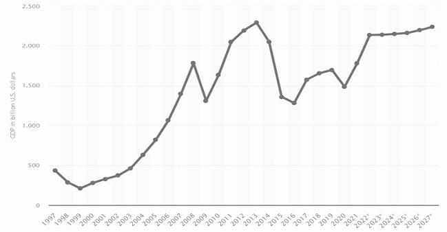 Since Vladimir Putin came to power in 2000, the GDP of the Russian Federation has consistently shown surpluses over the years, with brief setbacks during the 2008 financial crisis and the war in Ukraine in 2014. By 2027, Russia is expected to reach a GDP of 2.3 trillion dollars (Statista, 2023).