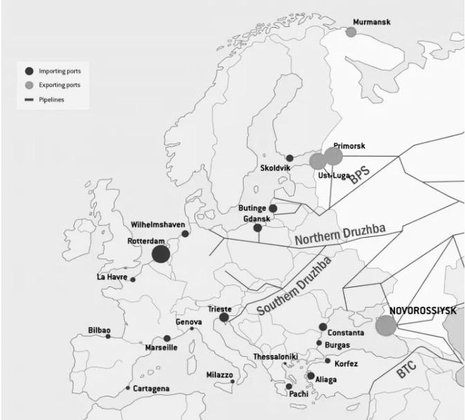 Generally, there is a complex gas pipeline and oil transport scheme involving Russia and the European Union. The Russian ports of Murmansk, Primorsk, and Novorossiysk (Novorussia), in the far West of Russia, are essential for maintaining this energy trade through the BPS, Druzhba (North and South), and BTC pipelines. Further details are provided below.