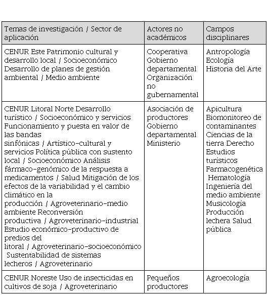 Cuadro 1: Temas de investigación, actores y campos disciplinares en proyectos de Centros Universitarios Regionales financiados por el programa VUSP