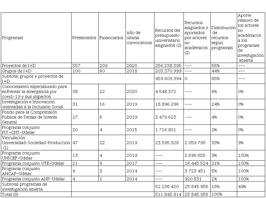 En particular se revisan cinco programas implementados por la Comisión Sectorial de Investigación Científica (CSIC) de la Udelar: i) Vinculación Universidad Sociedad y Producción (VUSP), vigente desde 1992; ii) Investigación e Innovación orientada a la Inclusión Social (IS), vigente desde 2008; iii) «Investigación en interacción con empresas y organismos del sector público e internacionales», vigente desde 2008; iv) «Conocimiento especializado para enfrentar la emergencia por covid-19 y sus impactos», implementado en 2020, y v) Fondo Universitario para la Comprensión Pública de Temas de Interés General (artículo 2), vigente desde 2008.