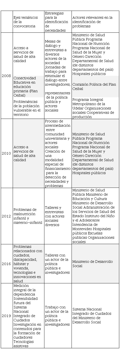 Entre las estrategias implementadas en CSIC para identificar problemas y necesidades cuya resolución o satisfacción requieren de CTI están i) la organización de jornadas de encuentro entre la academia y los actores diversos, de la política pública, de la sociedad, de la producción, etcétera, para la identificación de ejes temáticos prioritarios; ii) trabajo conjunto con actores específicos de la política pública, hospitales, empresas, etcétera, y iii) implementación de modalidades específicas para financiar la detección de necesidades y problemas. En el Cuadro 4 se presentan, con base en la experiencia de IS, las estrategias para la identificación de necesidades, los ejes temáticos de las convocatorias a las que dieron lugar esas necesidades identificadas y los actores relevantes para esa identificación en el período 2008-2019.