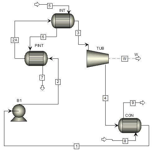 Al tener la simulación completa en Aspen plus el paso siguiente fue analizar la red de intercambio de calor con la extensión Aspen Energy Analyzer, la cual sugirió emplear dos intercambiadores de calor en serie para la corriente 5 el fluido geotérmico y la corriente 2 el fluido de trabajo como se observa en la figura 5, de acuerdo con lo anterior el primer equipo es un precalentador (PINT) y el segundo el evaporador (INT), el precalentador tiene función de llevar el isopentano hasta temperatura de ebullición a 10,5 bares como lo presentan otros autores (Tomarov & Shipkov, 2017), (Toffolo et al., 2014), este proceso trae beneficios como el aumento de la temperatura media logarítmica y la reducción del área global del sistema con el manejo de dos intercambiadores de menor área que un equipo por corriente.