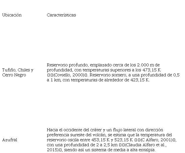 Al superar la fase de prospección hecha, se determina si un reservorio es aprovechable, de ser así al interior del mismo se construye un intercambiador de calor de pozo profundo, compuesto por dos tubos coaxiales insertados en el pozo, en el anillo externo se inyecta un fluido caloportador o geotérmico (Alimonti et al., 2019), que va a ser calentado en la profundidad del pozo debido al gradiente de temperatura, allí el fluido entra en el tubo interno y fluye hasta la cabeza del pozo, sucesivamente se traslada a un intercambiador de calor para transferir energía a un segundo fluido denominado fluido de trabajo, en la tabla 1 se encuentra la información básica los reservorios: Azufral y el territorio binacional Tufiño-Chiles-Cerro Negro, que evidencian la presencia de pozos a más de 150 °C.