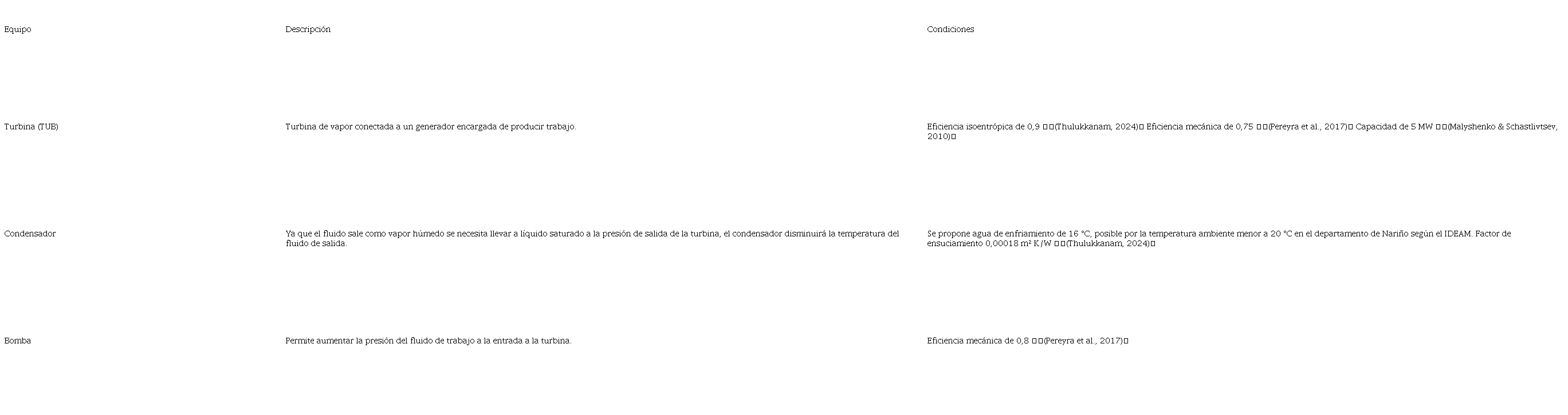 El objetivo del presente proyecto fue emplear la información de los fluidos geotérmicos de reservorios existentes en el departamento de Nariño para el diseño conceptual de una planta geotérmica incluyendo el diseño térmico y mecánico de estos equipos.