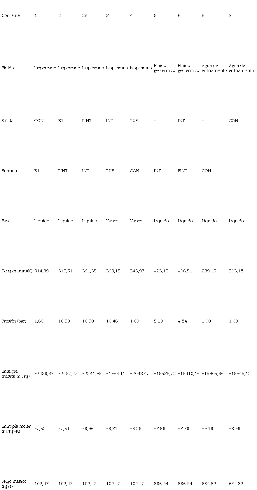 Para elegir las condiciones de proceso y los flujos como se mencionó anteriormente se limitó la cantidad de energía a producir en este caso de 5 MW, llegando a un flujo de 102,47 kg/s de refrigerante, 366,94 kg/s de salmuera y 684,32 kg/s de agua de enfriamiento para todo el proceso presentadas respectivamente como las corrientes 1, 5 y 8 en la Tabla 4.