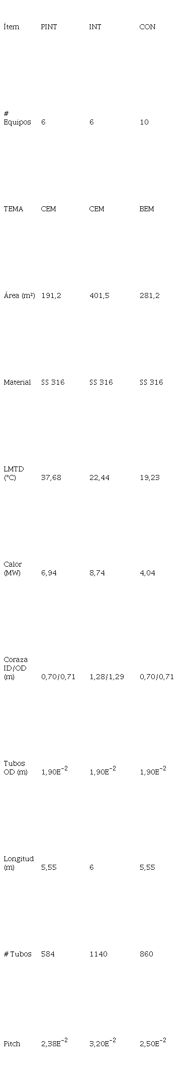 En el proceso se manejan tres intercambiadores identificados como PINT, INT y CON, para llevar a cabo el diseño mecánico es necesario definir el tipo de intercambiador a utilizar, la mejor opción resulta ser los intercambiadores de tubos y coraza debido a su estabilidad a altas presiones y temperatura, dependiendo del diseño los procesos de limpieza serán sencillos comparado con los intercambiadores de placas y así mismo se pueden adaptar con más accesorios, por otra parte evitan el uso de sellos o equipos totalmente soldados que dificultan los procesos de mantenimiento y reparación (Yu et al., 2021), como se muestra en la Tabla 3.