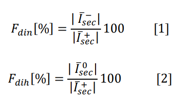 Una forma de estudiar el desbalance en los sistemas trifásicos es a través de su descomposición en tres sistemas trifásicos compuestos por: Un sistema balanceado de secuencia positiva o directa (coincidente con la secuencia del sistema de distribución en estudio), un sistema balanceado de secuencia negativa o inversa, (el cual posee una secuencia opuesta a la del sistema de distribución) y una secuencia homopolar o cero, compuesta por una terna de fasores de igual magnitud y fase. Contemplando la normativa internacional IEC (IEC 61000-4-30, 2008) o IEEE (IEEE Std 1159, 2009), el desbalance en un sistema trifásico se puede cuantificar a través de la relación entre la magnitud de la componente de secuencia negativa y lamagnitud de la componente de secuencia positiva, expresada comoporcentaje, a la cual llamaremos factor de desbalance en corrientes de secuencia negativa (Fdin), expresado por la ecuación [1]. Además, considerando la citada normativa, también es posible considerar la relación entre la magnitud de la componente de secuencia homopolar sobre la magnitud de la componente de secuencia positiva, expresada como porcentaje, a la cual llamaremos factor de desbalance en corrientes de secuencia homopolar (Fdih), y es expresado por la ecuación [2].