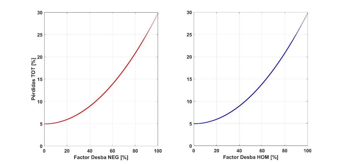 En la Figura 4, se muestran la correspondencia entre los valores del factor de corrección FdesbBT calculados en el estudio paramétrico realizado (el cual es aplicado en forma directa sobre las pérdidas calculadas para un sistema balanceado con el objeto de contemplar el incremento de las pérdidas por desbalance) y la relación porcentual Idesbalan/Ibalan de las distintas fases.