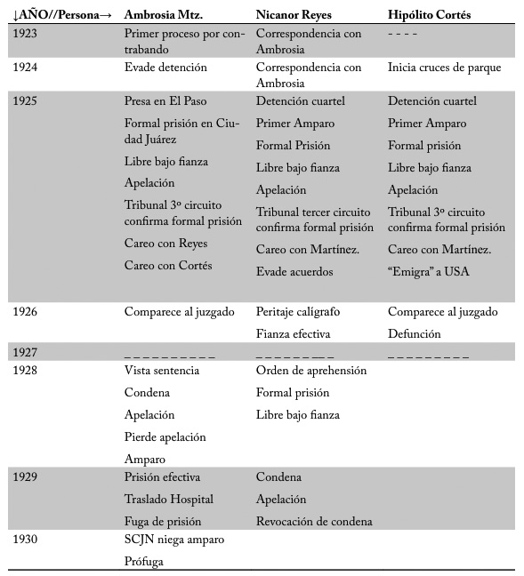 En otra feliz coincidencia, Francisco J. Ayón y Jesús A. Cuen –litigantes– tomaron la defensa legal de Ambrosia Martínez y Nicanor Reyes e Hipólito Cortés respectivamente. Estos dos abogados fueron por una década los representantes de Ignacia Jasso y Pablo González en la práctica totalidad de juicios de amparo y penales del ramo federal protagonizados por la conocida banda de Los Pablotes en los juzgados del distrito de Bravos.