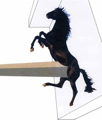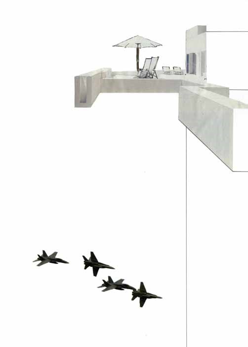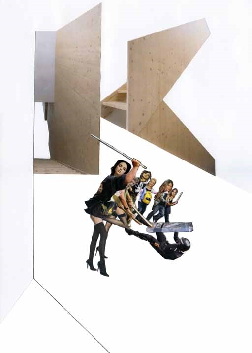En esta serie, Echeverría Kossak deja por un momento la pintura y experimenta con el collage. Sobre el papel blanco, levanta leves volúmenes de otras tonalidades de blanco para crear la sensación de planos espaciales; pega edificaciones, objetos y personajes cortados con delicadeza, dibuja conexiones. Construye escenas con imágenes tomadas de esa despensa infinita que es Internet, y, con el gusto de un coleccionista que sabe que algún día servirán para algo, las guarda en carpetas.