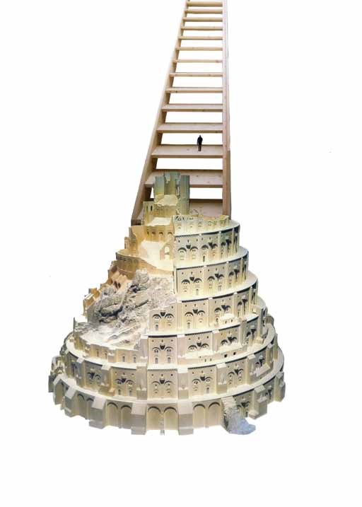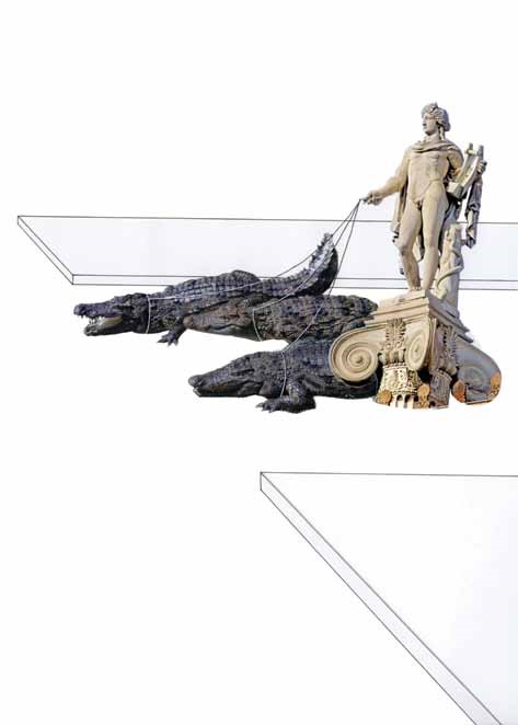 El espacio que el artista crea representa esa estructura con una colección de figuras fetiche —modelos del canon clásico, edificaciones poderosas, armamento de guerra— que tejen una narrativa cuyos símbolos parecen venir de un sistema orwelliano, en el cual 1984 no es un libro de ficción, sino un manual de estilo.