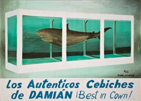 XA: Claro. En los tiburones de Hirst —que son los únicos que son réplica de réplica estrictamente hablando dentro de la serie— se ve claramente que ambas versiones son harto diferentes. El de arriba es el original y el otro es su copia, pero viene con una tipografía distinta, otro tamaño, otros colores… Y ver eso es fascinante, porque abre preguntas sobre qué significa hacer una réplica y hacer evidente las variaciones que se dan a nivel manual, que fueron elecciones deliberadas de Don Pili, para que el cuadro no sea una copia, pese a que esa era la consigna.