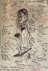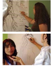 Diseñé una metodología de reflexión y diálogo conjuntos para la construcción de la imagen de la Patrona; también dinámicas de expresión y trabajo creativo, en las cuales todas tenían voz y voto en las propuestas conceptuales, discursivas, gráficas y estéticas elaboradas colectivamente. La dinámica y estrategia de generación de la imagen iconográfica, en su fase inicial, consistió en la elaboración de un identikitboceto sobre la base de las ideas sobre por qué y cómo debía ser y verse esta representación femenina. La plegaria que acompaña a la imagen también fue una producción conjunta, creada desde sus realidades, imaginarios e intereses.