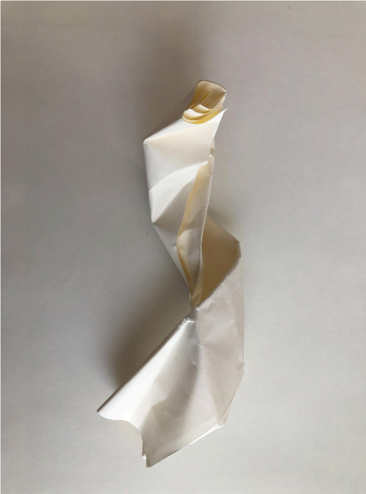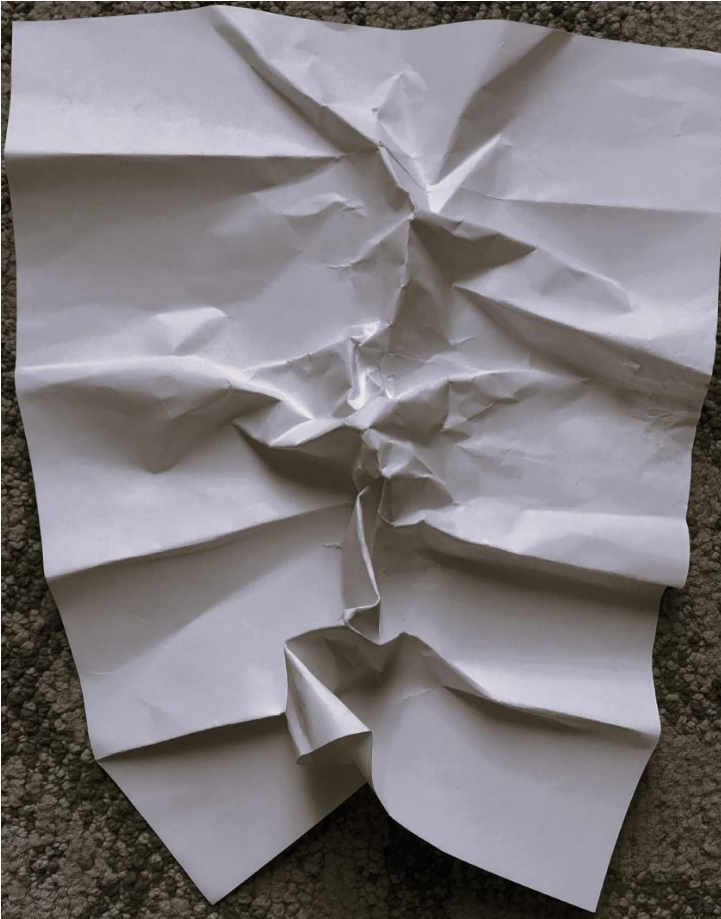 En el otro ejercicio, donde cambia la dirección y aparecen otras texturas, el gesto dejaba entrever nuevas dimensiones latentes en el encuentro. Jessica traza una espiral, una textura rígida que ocupa todo el papel. Yo desarticulo esa hoja añadiéndole más rigidez, doblándola en partes iguales. Uno proponiendo espirales de pensamiento, otro fragmentando para demarcar territorialidades.