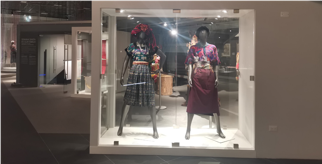 Continúo el recorrido y llego al final de la exhibición arqueológica. Un acceso amplio me dirige a la sala etnográfica y en la parte superior leo: «Nuestros ancestros guatemaltecos: divinos señores que han trascendido en tiempo y espacio», y del otro lado observo varios maniquíes grises vestidos con indumentaria maya. Dos estelas de período Preclásico enmarcan la entrada a la sala de etnología y sugieren un mensaje arriesgado, aquel de una continuidad representada por medio de figuras sin rostro, subrayando solamente la calidad de las texturas y los colores de los textiles.