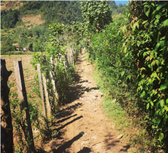 En este espacio también vemos una casa alargada hecha de block (bloques de hormigón), construida hace unas décadas por pobladores de Pulai. Al caminar del otro lado de la casa observamos otras dos estructuras antiguas. Mi tendencia inmediata es querer mapear el sitio arqueológico, pero como no tenemos autorización del dueño de este terreno, rápidamente elaboro un croquis y tomo algunos puntos GPS. Te’k sugiere seguir caminando por las veredas que nos adentran a otros terrenos de la aldea, queremos observar las diferentes elevaciones del área, pues donde no hay casa de habitación hay cultivos. En todo el valle encontramos tiestos, restos de cerámica antigua dispersos en el suelo, y en las faldas de la siguiente montaña, más al sur, se veían hileras de piedras alineadas de este a oeste, formando terrazas de cultivo. Caminamos entre terrenos y casas a través de senderos que reflejan serenidad y calidez matutina, un color verde-amarillo que se siente solo de Cotzal.