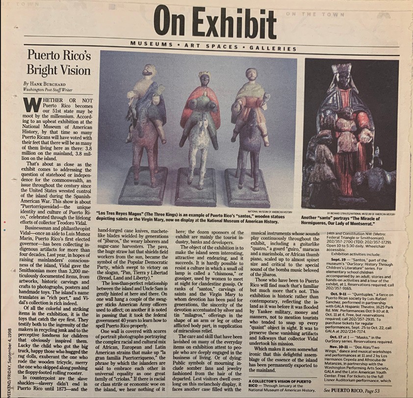 Según su propio testimonio, Vidal coleccionó un país que veía desaparecer como resultado de las políticas del gobierno para el que trabajaba. El país cambió, pero los objetos permanecieron. Y luego, una gran parte de ellos fue a parar al Smithsonian, donde ayudaron a suplir la notoria ausencia de representación latina en la institución. Marvette Pérez, la primera curadora puertorriqueña en el Smithsonian, estuvo a cargo de recibir la donación y curar una exposición con la colección, coincidiendo con el centenario de la invasión estadounidense a Puerto Rico.
