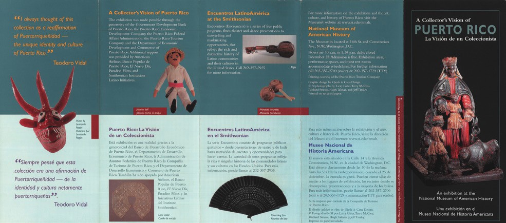 Pero ¿por qué Teodoro Vidal quería que su colección estuviera en el Smithsonian? Como asesor cercano de Luis Muñoz Marín, el primer puertorriqueño electo como gobernador, estaba comprometido con la construcción de un proyecto cultural que acompañara el programa de modernización industrial que transformó a Puerto Rico en los años cincuenta. Mientras la Operación Manos a la Obra empujaba a muchos fuera del campo hacia fábricas en centros urbanos, y luego hacia el noreste de Estados Unidos, la Operación Serenidad era el brazo cultural del gobierno que buscaba apaciguar el sentimiento nacionalista mediante una celebración de las tradiciones puertorriqueñas que mantenía nuestra identidad dentro de los límites de sujetos coloniales bien portados.