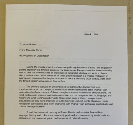 También es mi prima lejana, porque, claro, en Puerto Rico todos somos primos de algún modo. Aun así, desde su repentina muerte hace cerca de una década, solo queda un tenue rastro de su presencia en los archivos de la institución. Los pocos documentos que encontré en el Smithsonian sobre su trabajo fueron una serie de informes que presentó durante una licencia para escribir su tesis doctoral. En ellos, cuestiona la ideología de la preservación histórica en Puerto Rico, articulando algunas de nuestras propias inquietudes sobre la Colección Teodoro Vidal. Su concepto también nos ayuda a pensar críticamente sobre las lógicas dominantes que definen el cuidado adecuado de los materiales históricos y que priorizan el control climático por encima del acceso, por ejemplo.
