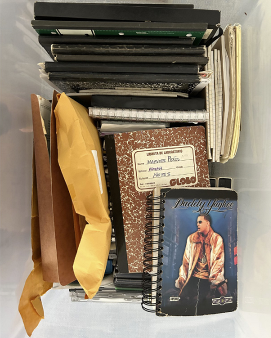 S: Irónicamente, y quizá inevitablemente, encontré los cuadernos de Marvette en el clóset de su amigo Ramón, quien también es mi amigo. Él los había recogido de su oficina y de unos cajones metálicos que quedaron en un pasillo, destinados a la basura después de su fallecimiento. Encontrarlos fue un recordatorio impactante de cuánto falta en el archivo imperial y, en contraste, cuántos tesoros se resguardan en los hogares de quienes honran la memoria de sus seres queridos.