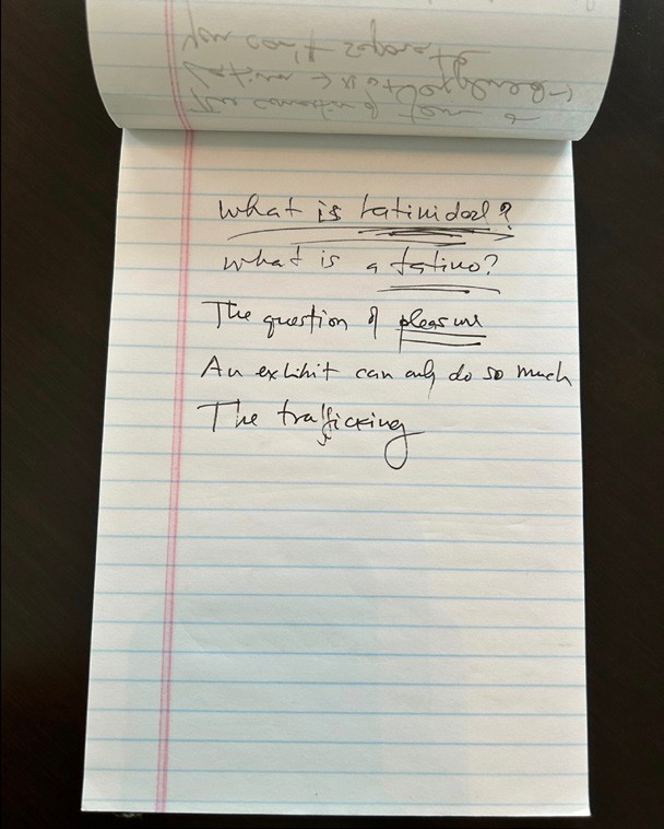 S: Al leer las palabras de Marvette, sentimos que una ancestra nos hablaba desde el pasado, validando nuestros sentimientos. Ante la ausencia de documentación sobre la procedencia o adquisición de la Colección Teodoro Vidal, estos cuadernos revelan los límites de la inclusión y las tensiones inherentes a este tipo de intercambio. Uno de ellos documenta el proceso de embalaje en la casa de Vidal, en Puerto Rico, incluyendo el momento en que una artista famosa llegó con un amigo y un fotógrafo a denunciar que se estaban llevando nuestro patrimonio. Vidal publicó extensamente sobre las prácticas, los artesanos y los sistemas de creencias representados en su colección, y realizó valiosas contribuciones como historiador autodidacta. Sin embargo, la mayoría de los objetos que donó al Smithsonian carecen de información. Sus cuadernos y grabaciones de campo están en Puerto Rico; lo que llegó a los contenedores de almacenamiento son principalmente etiquetas escritas por él mismo durante el embalaje.