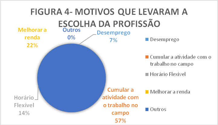 As respostas fornecidas indicam que a busca pela ocupação decorreu, principalmente, da liberdade de horário e possibilidade de conciliar a atividade com a ocupação no campo. Todavia, evidenciam a vulnerabilidade com a exaustiva carga horária, já que a grande maioria concilia a atividade profissional com o trabalho realizado na agricultura.