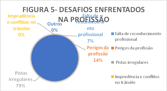 A falta de infraestrutura das vias, a ausência de sinalização adequada foram os principais fatores citados pelos respondentes como desafios a serem enfrentados. Aliado a este fato, também os perigos decorrentes de assaltos e mortes no trânsito são problemas que afligem a categoria.