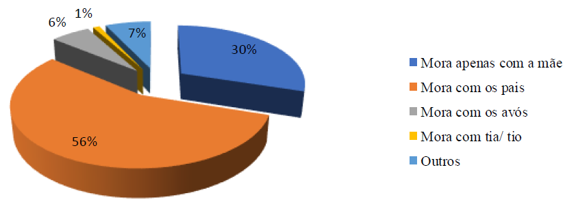 No cenário geral dos estudantes da escola, independente da nacionalidade, constata-se que mais da metade dos estudantes moram com seus pais, mas uma boa parcela (30%) mora somente com a mãe.