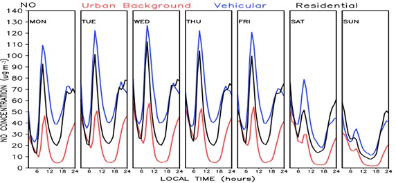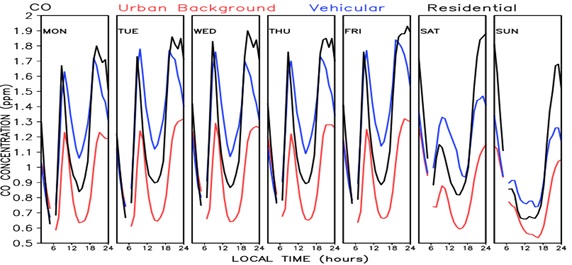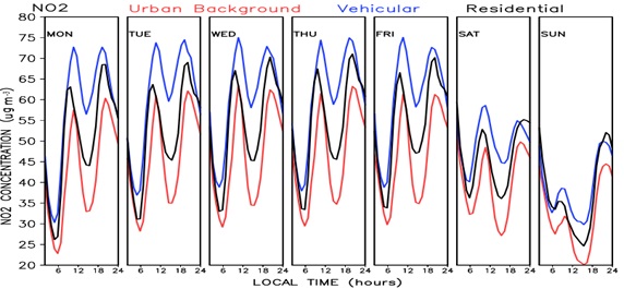 The 16-year diurnal and weekly cycles of the criteria pollutants is shown in figure 3. There are clear differences in the hourly behaviour among the different pollutants analysedaccording to their land use types