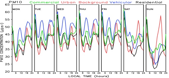 Analysis of the hourly standard deviations (data nor shown) indicates that, for all pollutants, temporal variability is higher during the times of maximum diurnal concentration (morning and night for primary pollutants, mid-afternoon for ozone, etc.). This implies that emission conditions also play an important role in the long-term diurnal variability of pollutants. T-student tests were applied to test the difference between pollutant concentrations in the weekly scale in different sites(ex: PM10 at the residential site vs. PM10 at the commercial site, and so on) was found significant for the 99% interval for all tests, except for the difference betweenthe residential and vehicular sites for CO, (95%).
