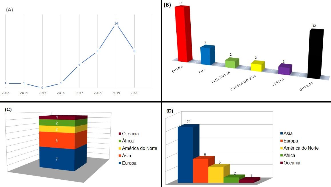 Olhando as quantidades de publicações por continente, apresentada na Figura 2(D), é nítida a preponderância asiática, sendo que tal fato parece ser devido às publicações chinesas, que respondem por mais de 76% dos estudos realizados naquele continente e aqui analisados.