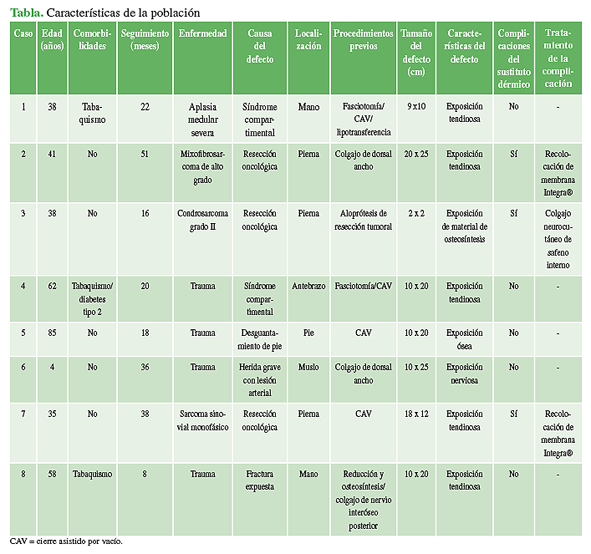 Se identificaron 11 pacientes en los cuales se utilizó un sustituto dérmico para el manejo de defectos de cobertura durante el período estudiado (Tabla). Ocho pacientes cumplieron con los criterios de inclusión (2 mujeres y 6 hombres). Todos los pacientes incluidos en este estudio tenían cirugías previas por su enfermedad de base (tumores) o en el contexto de cirugías de urgencia (trauma, síndrome compartimental).