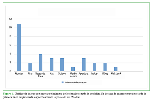 Todos los jugadores encuestados eran mayores de 18 años cuando se lesionaron. La mediana de edad al lesionarse fue de 19.5 años (rango 15-28). Todos los jugadores lesionados jugaban en forma amateur. El 75% de los jugadores lesionados realizaba un entrenamiento especializado durante un promedio de 7 h por semana (entre 2 y 18 h). En cuanto a la posición, 23 de los 32 deportistas jugaban como forwards (74%), de los cuales 11 ocupaban la posición de Hooker, la posición más riesgosa (Figura 1).