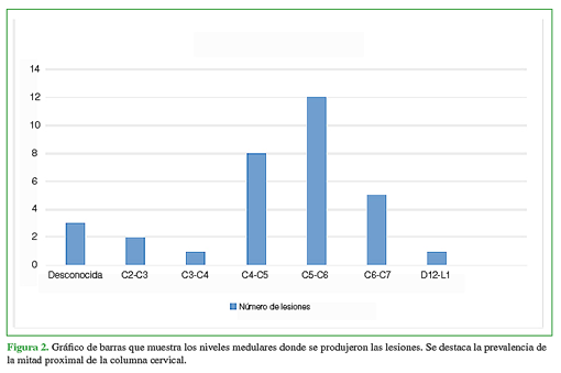 Como mecanismo de lesión, se identificó a la hiperflexión cervical con rotación o sin rotación en un 59% de los casos. El sector de la columna afectado con más frecuencia fue entre los niveles C4-C5 y C6-C7, es posible el compromiso de más de un nivel (Figura 2). Las lesiones de la médula se dividen en sección completa o incompleta, y la primera es la más frecuente.