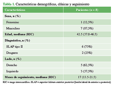 El grupo de estudio incluyó a ocho pacientes, siete (87,5%) eran hombres. Los pacientes eran activos, practicaban deportes recreativos y actividades sobre la cabeza, pero no habían sido tratados por accidentes de trabajo ni por Aseguradora de Riesgo de Trabajo. La mediana de la edad era de 42.5 años (RIC 37.0-46.5). La mediana de seguimiento fue de 17 meses (RIC 13.5-21.5). Seis de los pacientes (75%) tenían un diagnóstico preoperatorio de lesión SLAP tipo II y dos (25%), de desgarro completo. En seis casos (75%), se llegó a la cirugía con diagnóstico por imágenes de resonancia magnética compatibles con lesión SLAP. Los dos pacientes con desgarro completo tenían 42 y 56 años. El promedio de edad de los pacientes con lesión SLAP era de 39 años.