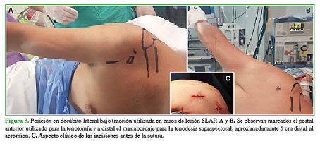 En todos los casos, se administró anestesia general con bloqueo para el manejo del dolor posoperatorio. La cirugía se realiza con el paciente en decúbito lateral bajo tracción en los casos de lesión SLAP. En primer término, se efectúa una artroscopia glenohumeral. Se usa un portal posterior y uno anterior. Una vez evaluada la patología y definida la indicación (lesión SLAP inestable más signos degenerativos y de patología del tendón articular como engrosamiento e inestabilidad), se procede a la tenotomía de la porción larga del bíceps con radiofrecuencia por el portal anterior. Luego, en la misma posición, se realiza un abordaje longitudinal anterior en el tramo más distal deltopectoral, habitualmente a 5 cm a distal del extremo anterolateral del acromion. La disección se practica a través del intervalo deltopectoral. Una vez desarrollado ese intervalo, se separa el deltoides hacia lateral con una palanca de Hohmman para visualizar la cara anterior del húmero. Se identifica la corredera bicipital, se incide en ella y se recupera traccionando el cabo del tendón del bíceps tenotomizado previamente. A continuación, se cruenta la superficie ósea. Tras determinar el punto de reinserción y fijación, se regulariza el extremo del bíceps y se prepara según el método de fijación que puede consistir en arpones convencionales o diseñados para tenodesis, tornillos de biotenodesis o fijación ósea. Es importante mantener el codo en extensión para lograr una adecuada tensión. En este caso, el miembro superior está bajo tracción. Si se recurre a anclajes, se puede reasegurar la fijación con puntos al pectoral mayor. Finalmente se sutura por planos. En los casos de rotura del bíceps se realiza directamente el miniabordaje descrito con el paciente en posición de silla de playa. Luego se inmoviliza con cabestrillo por cuatro semanas. Se indican movimientos pasivos a las tres semanas y luego fisiokinesioterapia (Figuras 2,3,4).