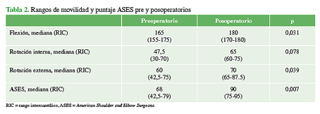 Las medianas de los rangos de movilidad prequirúrgicos fueron: flexión 165° (RIC 155°-175°), rotación interna 47,5° (RIC 30°-70°) y rotación externa 60° (RIC 42,5°-75,0°). Las medianas de los rangos de movilidad finales fueron: flexión 180° (RIC 170°-180°), rotación interna 65° (RIC 60°-75°) y rotación externa 70° (RIC 65°-87,5°) (Tabla 2).
