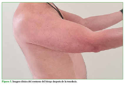 No se registraron complicaciones generales, como infecciones, ni relacionadas con la técnica quirúrgica. No se observaron desinserciones de la tenodesis (signo de Popeye) (Figura 5).