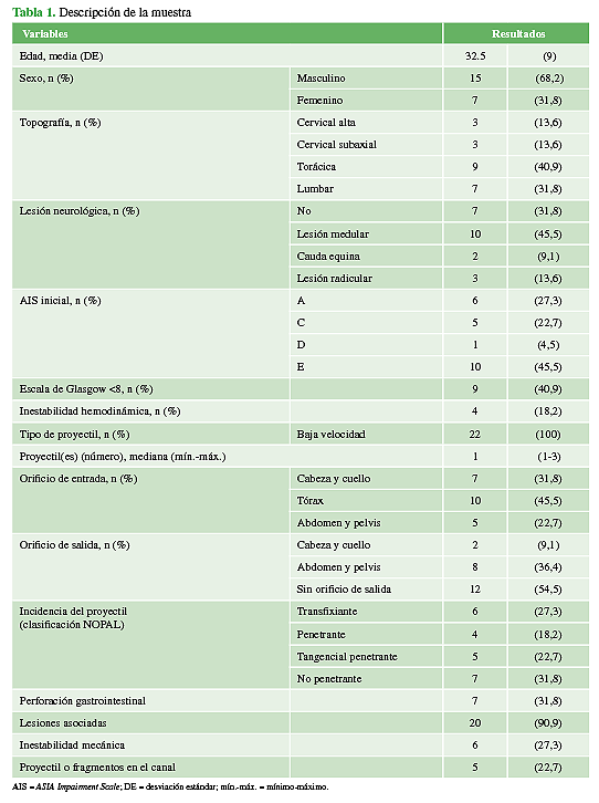 Todos los casos eran consecuencia de agresiones por proyectiles de baja velocidad. El orificio de entrada era torácico en el 45% (n = 10) de los pacientes, seguido de la cabeza y el cuello (n = 7; 32%). En 12 casos (54%), no se registró un orificio de salida del proyectil. La incidencia del proyectil era predominantemente no penetrante (n = 7; 32%) o transfixiante (n = 6; 27%); seguida de tangencial penetrante (n = 5; 23%) y penetrante (n = 4; 18%). En cinco (23%) pacientes, se constató el proyectil (n = 4) o sus fragmentos (n = 1) alojados en el canal vertebral. La lesión vertebral se consideró inestable en seis (27 %) casos. La descripción de la muestra se resume en la Tabla 1.
