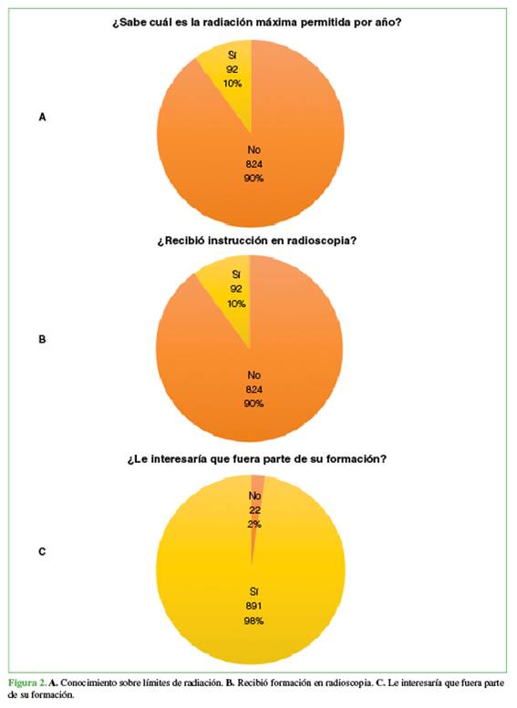 De las 916 respuestas recibidas (3 omitidas), el 89,7% (n = 824) manifestó desconocer la radiación máxima permitida por año, y solo el 17,2% afirmó haber recibido instrucción específica sobre el uso de la radioscopia y las medidas de protección. Además, el 97,59% de los encuestados expresó interés en que dicha capacitación fuera parte de su formación profesional (Figura 2).