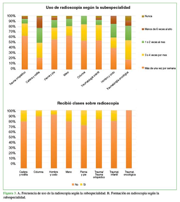 Discriminando entre las diferentes subespecialidades, quienes utilizan la radioscopia frecuentemente (más de una vez por semana) son los especialistas en mano (63%), en trauma (62%), y en pierna y pie (56%). Comparativamente, quienes recibieron instrucción o formación en el uso de la radioscopia fueron, en su mayoría, los cirujanos de pie/tobillo (25,7%, n = 105); en trauma, solo el 15% (Figura 3).