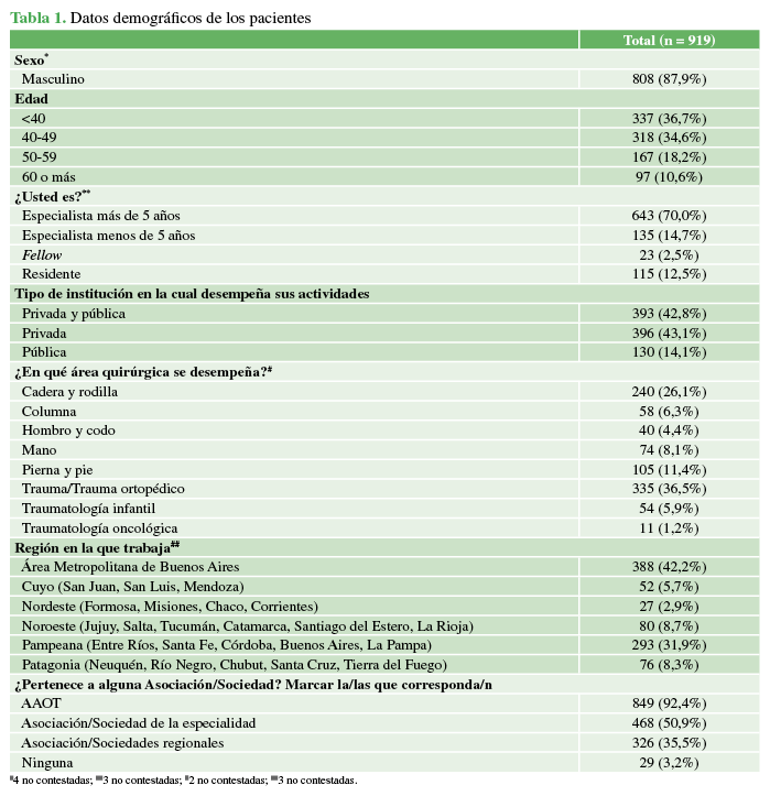 Un total de 919 traumatólogos respondieron la encuesta. Algunas preguntas eran opcionales, y el rango de respuestas fue de 913 a 919.