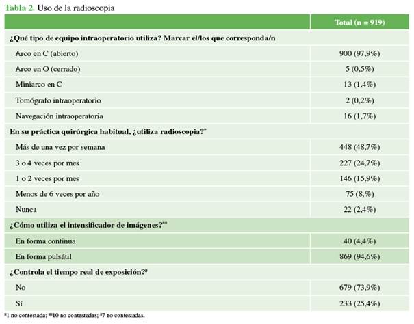 De las 919 respuestas, surge que el equipo más utilizado durante la cirugía fue el arco en C (97,9%). En cuanto a la frecuencia de uso, casi la mitad (48,7%) utiliza radioscopia más de una vez por semana; el 94,6% lo hace de forma pulsada. Asimismo, la mayoría (73,9%, n = 679) indicó no controlar el tiempo real de exposición a la radiación. Quienes mencionaron que nunca la usan (2,4%) pertenecen a todas las subespecialidades (Tabla 2).