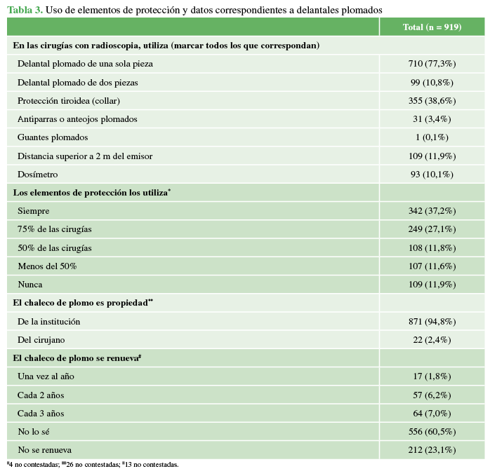 En relación con la frecuencia de uso de los elementos, el 11,9% (n = 109) mencionó no utilizarlos, mientras que el 37,2% los usa siempre y el 11,8%, la mitad de las veces. Específicamente, en cuanto al chaleco plomado, el 94,8% de los encuestados indicó que pertenece a la institución donde trabajan, mientras que, en 22 casos, es propiedad del cirujano. En la pregunta sobre la renovación del chaleco, el 60,5% lo desconoce y el 23,1% afirma que no se renueva (Tabla 3).